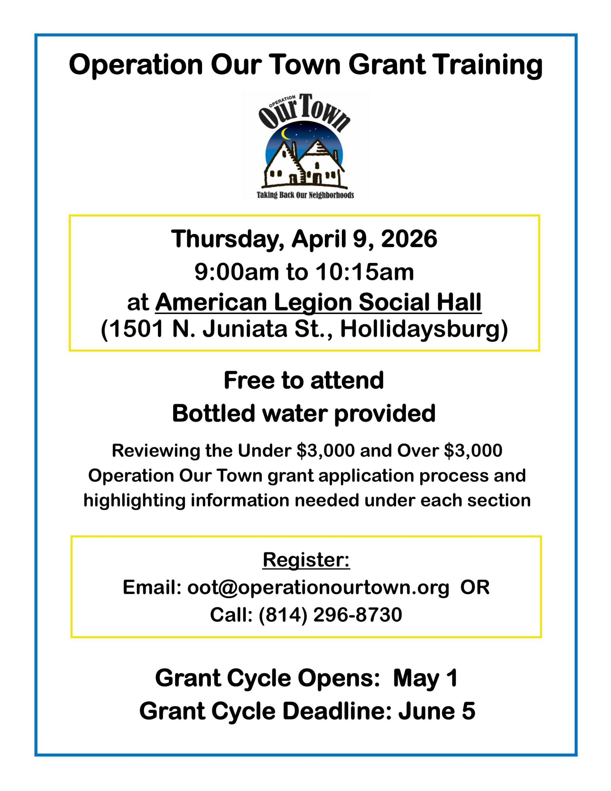 Due Date: One (1) original and ten (10) copies of applications must be delivered or mailed to Operation Our Town by June 5, 2026. Any applications that are mailed must be postmarked by this date.